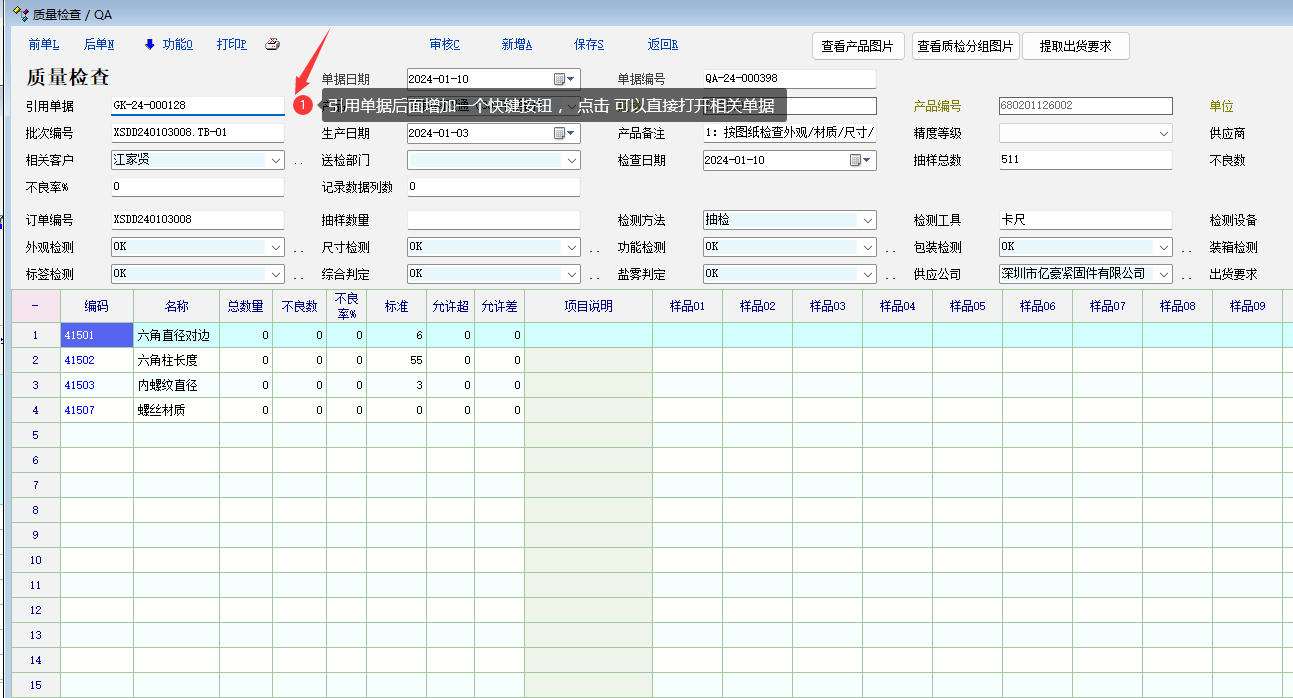 如图: 质量检查单据的上级是不同的单据, 想要查看的时候, 目前不能快速打开相关单据,只能复制,再单独去找单。