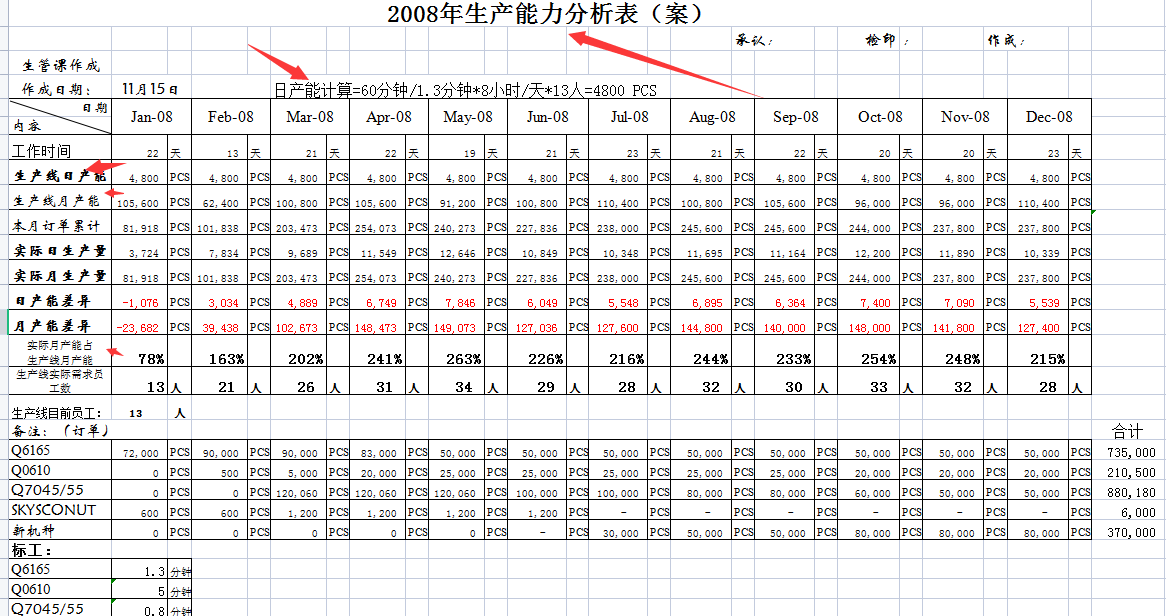 2、产能分析表-----用于计算生产线日产能、月产能,人员,需要的生产时间等的统计,用于生产排产参考。