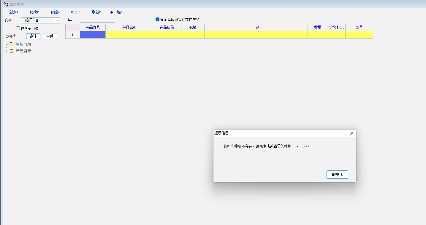 库位点击设计提示模版不存在,点击确认它只是关闭了弹窗,不会生成模版,只能在仓库下生成,但不同步到库位