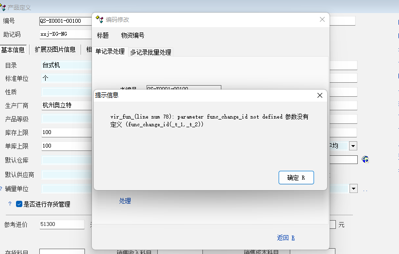 在产品中-产品记录编辑脚本定义中写入脚本,只要把下面的脚本删除,在修改产品编码时就会报错,第一次遇到