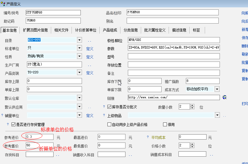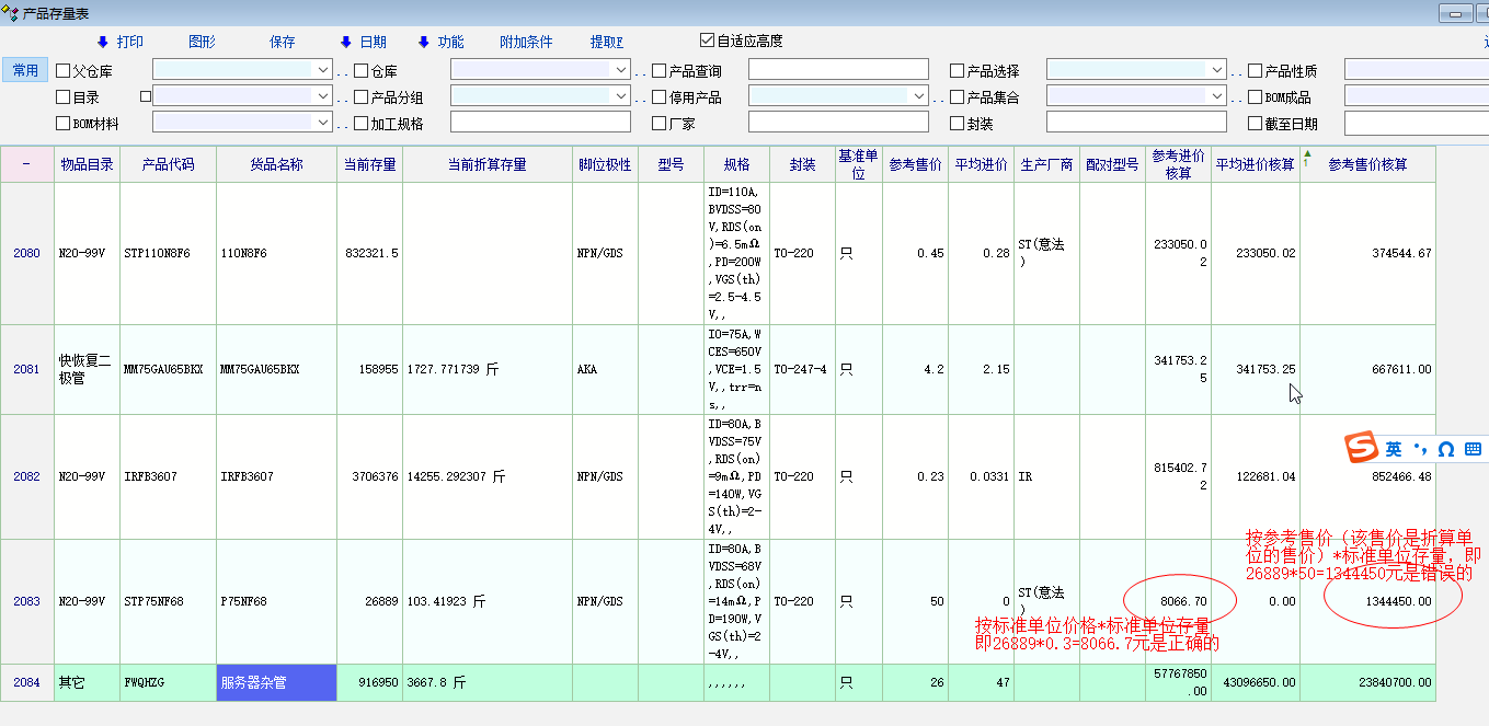 如图1所示。参考进价个参考售价系统引用最近的物资单据的价格。但是没有统一采用标准单位的价格,导致了产品存量表中存量产品库存金额计算错误。建议产品定义中的参考进价和参考售价都统一采用标准单位价格。如果物资单据中的单价是按照折算单位计价的自动换算为标准单位的价格。或者在存量报表中将计算公式改为标准单位*标准单位单价或者折算单位*折算单位价格。