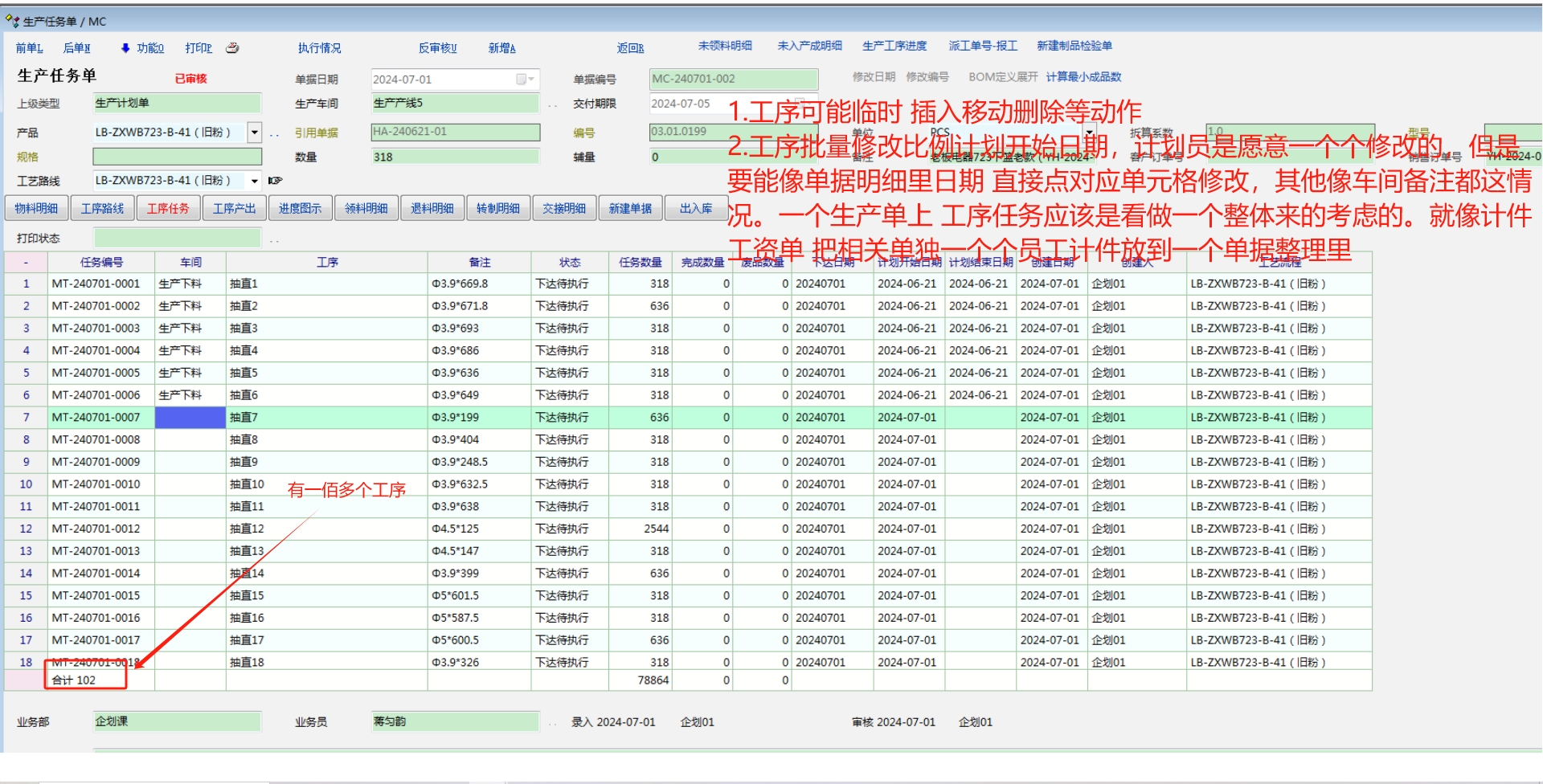 +_+........ 这个写 抽直1-102 这种工序名, 意义有多大啊? 同一个产品, 一道工序, 备注又那么多规格不一样, 数量也不一样. 会不会设计得生产管理太细了? 这样如果有调整确实非常麻烦. 时间顺序的变化, 插入或修改时. |