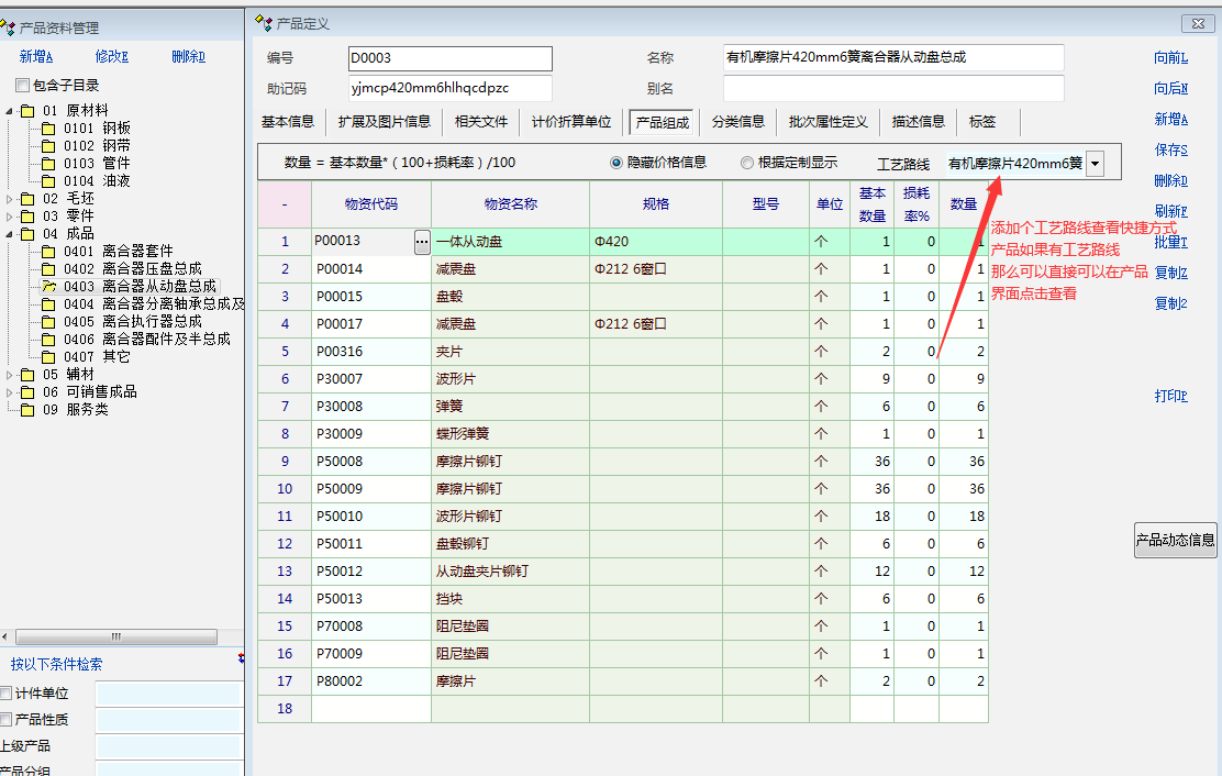 这样在产品资料界面能够在成品里面快速检索到,哪些已经完成了产品组成、工艺路线等工作,哪些没有完成,以便于快速查找、新建没有完成的产品组成与工艺路线。