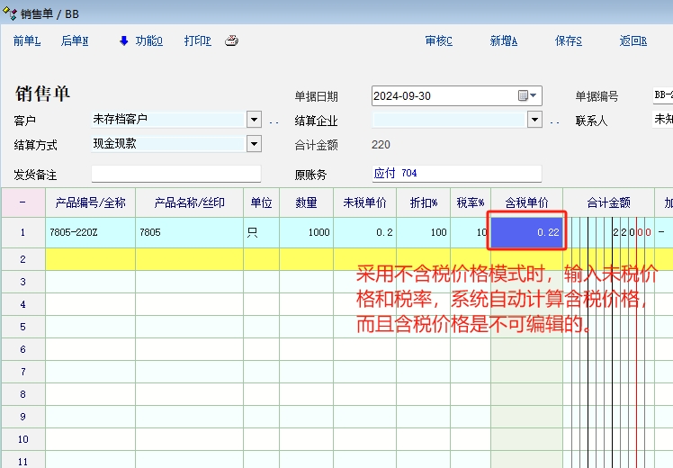 不管采用哪种模式,含税价格和未税价格只能是一个处于可编辑状态,另外一个由系统结合税率自动计算得出。税率确定了的情况下,我们要么只能输入含税价格,要么只能输入未税价格,两者是数学运算关系,不能两者都可以同时手动输入。