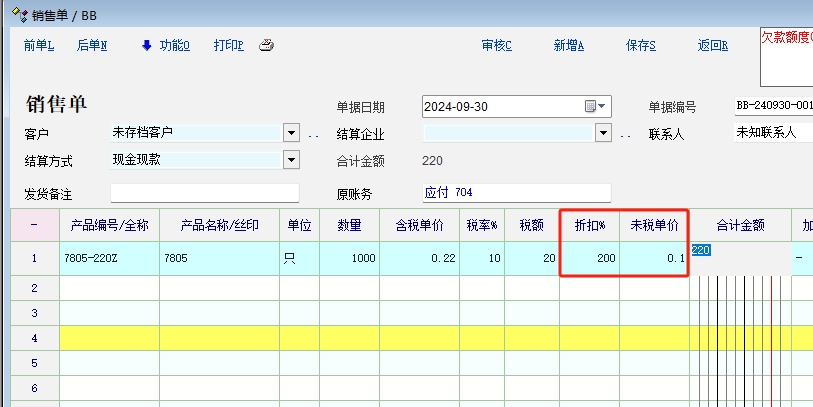 如图,把未税单价修改为0.25,系统的含税价格0.2486和税率13%都保持不变,合计金额也保持不变,而折扣自动变为了88%。正确的逻辑应该是修改了未税单价,税率和折扣都保持不变,但是含税价格自动重新计算调整。