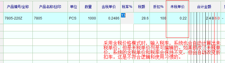 系统中,当采用不含税模式,输入未税价格和税率时,含税价格是一个系统自动计算出来的结果,含税价格列不可以编辑。这是对的,符合逻辑的。但是当采用含税模式时,输入含税单价和税率,系统也会自动计算出未税价格。但是此时的未税价格列处于可编辑状态。未税价格列处于可编辑状态也没有问题,关键是如果修改了未税价格,税率和含税价格系统会保持不变,然后系统自动修改了折扣。这是不符合逻辑和日常认知、使用习惯的。