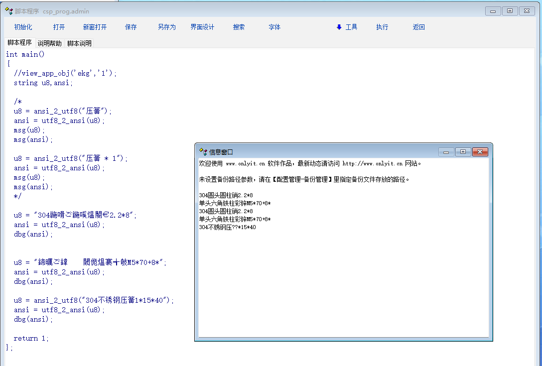 孟老师, 脚本我测试了一下. 单独的压簧是OK的, 但是合在一起, 就出问题了. int main() { //view_app_obj('ekg','1'); string u8,ansi; /* u8 = ansi_2_utf8("压簧"); ansi = utf8_2_ansi(u8); msg(u8); msg(ansi); u8 = ansi_2_utf8("压簧 * 1"); ansi = utf8_2_ansi(u8); msg(u8); msg(ansi); */ u8 = "304鍦嗗ご鍦嗘煴閿2.2*8"; ansi = utf8_2_ansi(u8); dbg(ansi); u8 = "鍗曞ご鍏閾佹煴褰╅攲M5*70+8*"; ansi = utf8_2_ansi(u8); dbg(ansi); u8 = ansi_2_utf8("304不锈钢压簧1*15*40"); ansi = utf8_2_ansi(u8); dbg(ansi); return 1; }; |