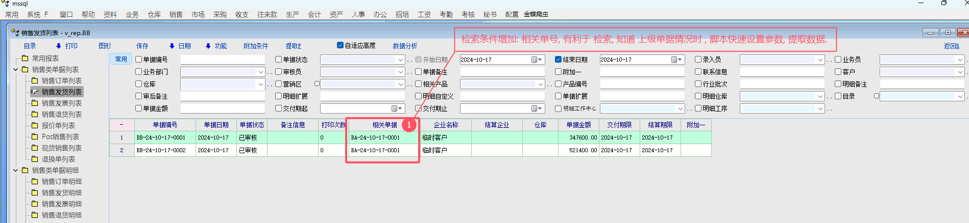 只查看当前订单的销售发货单列表. 设置检索条件时, 发现没有  相关单号 的控件.