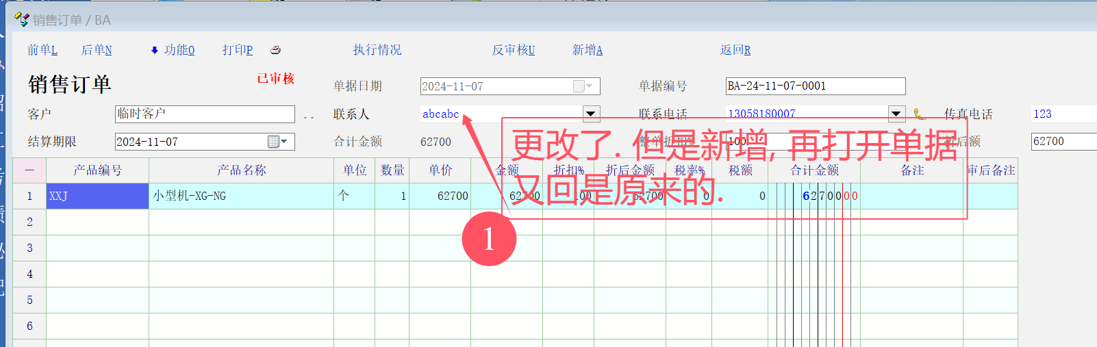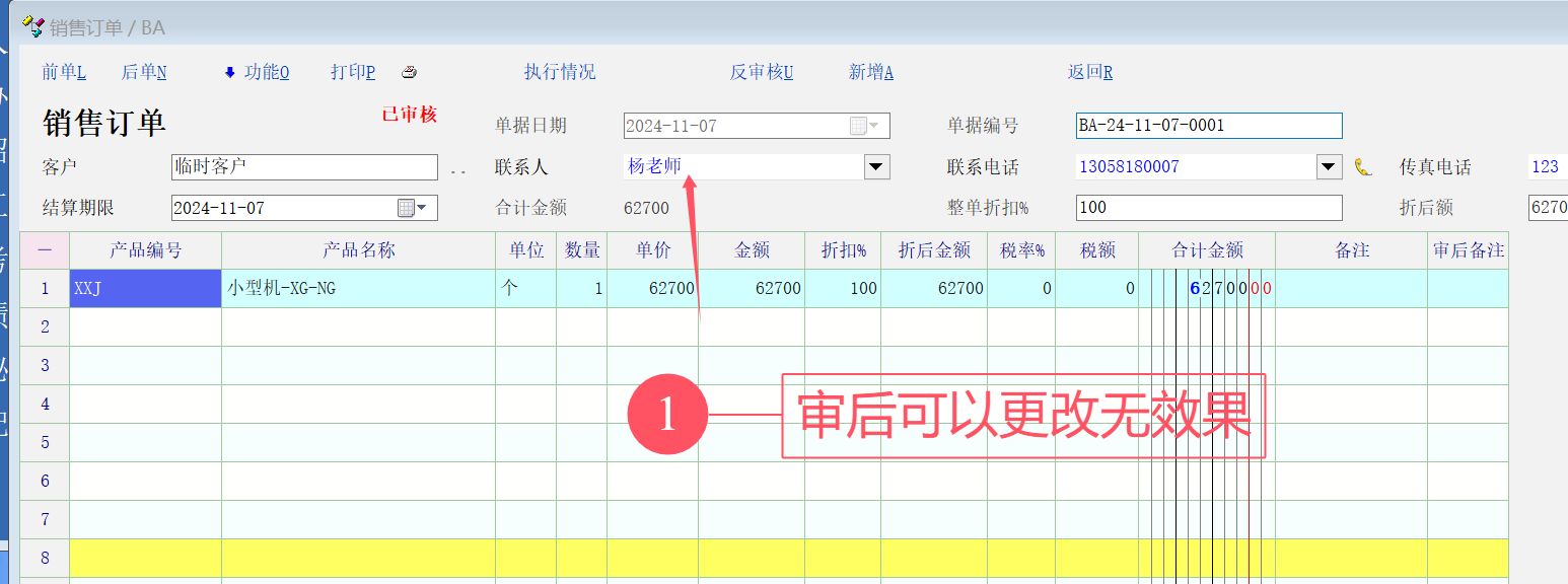 所以将联系人定义为审后允许编辑的字段,  但是没有效果, 改了之后,前单, 后单, 再次打开, 又变回改之前的了.