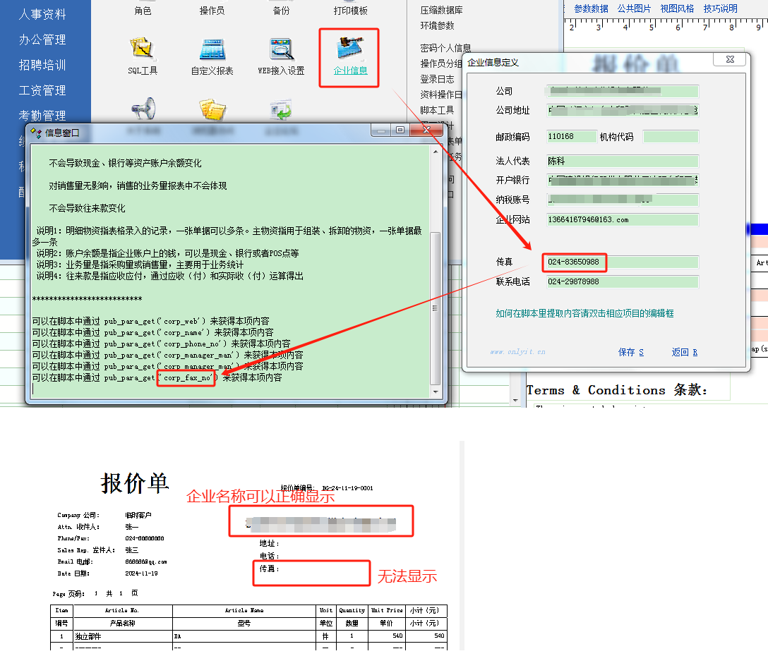 在打印模板中配置了企业信息的名称和传真,企业名称可以正确显示,但其他字段,包括:地址、电话、传真都无法正确显示。请问是否可以帮忙看一下。