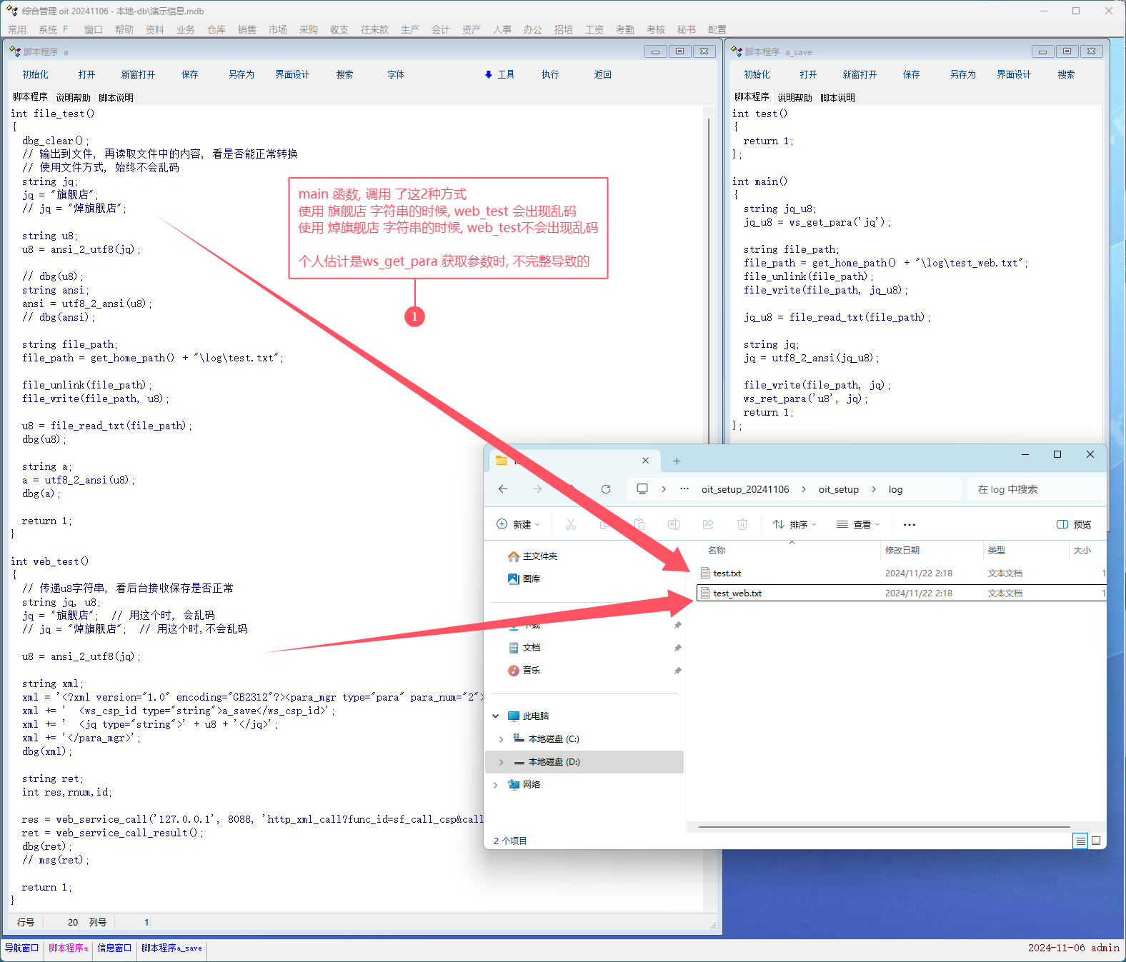 应用场景: web对接时, 很多时候以utf8字符集为标准, 这时候通过webservice 输入到 oit, 接收字符参数, 再转ansi码, 会出现乱码现象. 为此专门做了详细的测试. 1. 脚本单独写入到某个文件, 再读取转换, 正常. 2. 通过web传输, 某些字符串会出现乱码现象, 某些不会出现. 具体等孟老师测试. 提供1106最新演示库测试. 脚本工具中的脚本 a 测试 , 调用了 web服务脚本 a_save. |