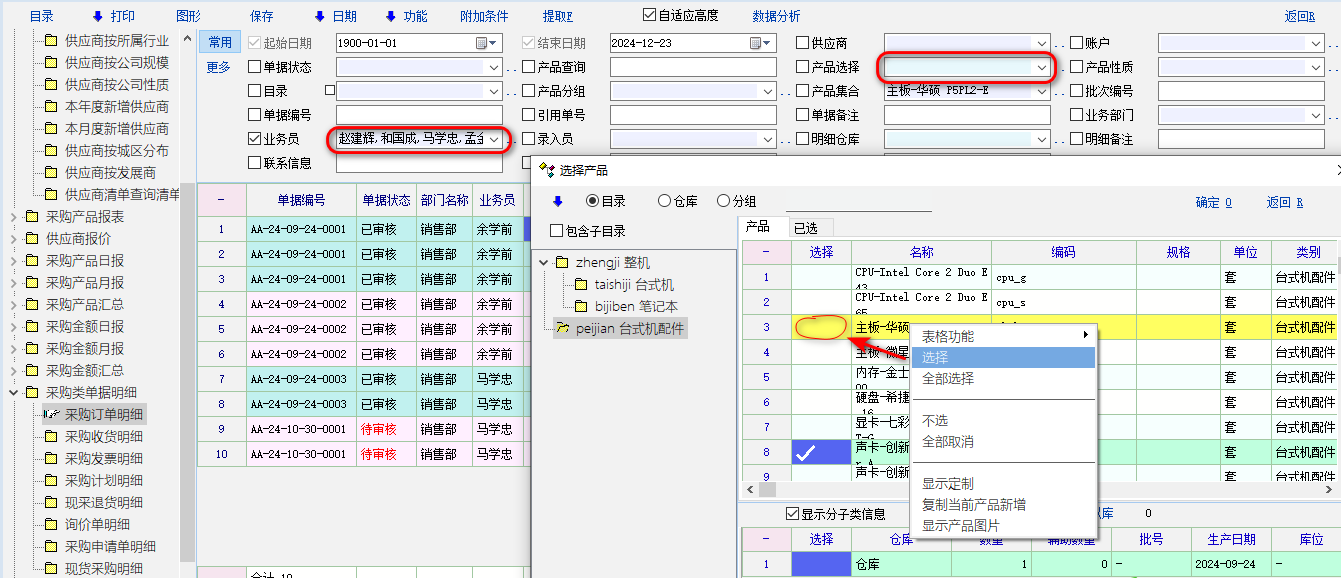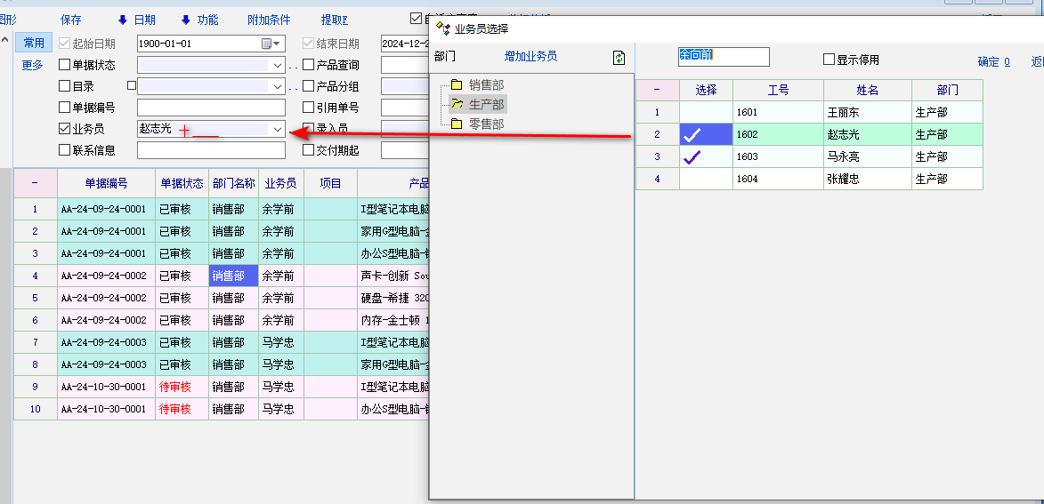 报表的搜索栏的“业务员”或“产品”只能选择一个(选择界面能打两或多个勾,但实际只能先一个)