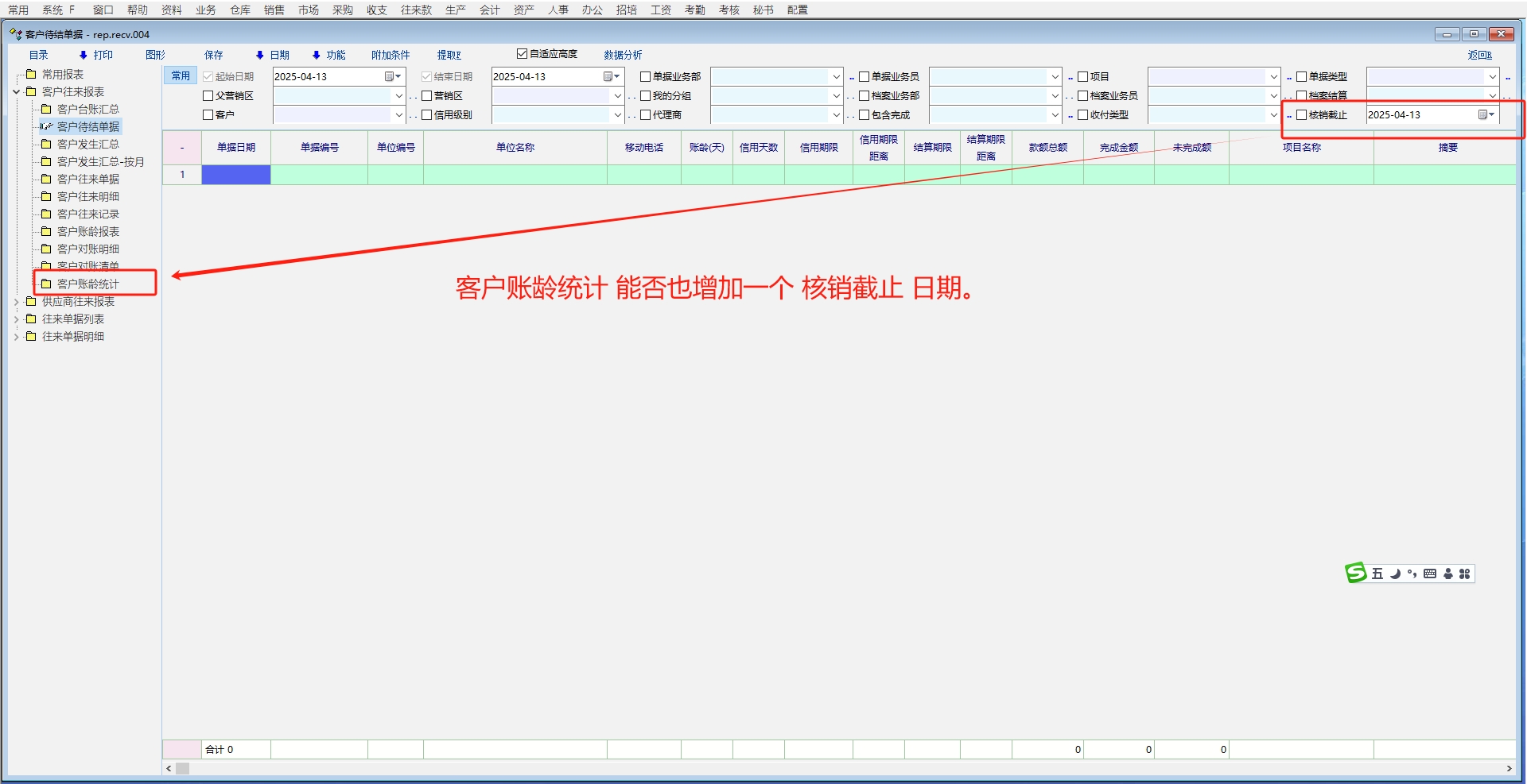 客户账龄统计 能否也增加一个 核销截止 日期。