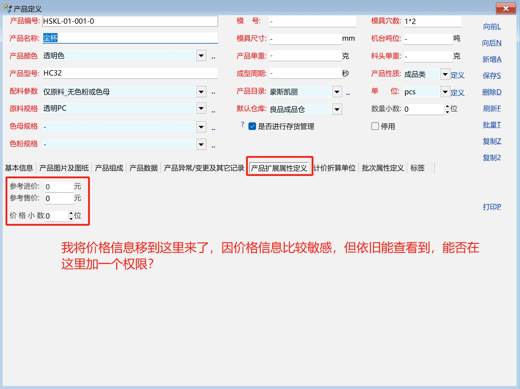 求助_产品定义中将价格信息移动了,但可否加一个权限?_产供销