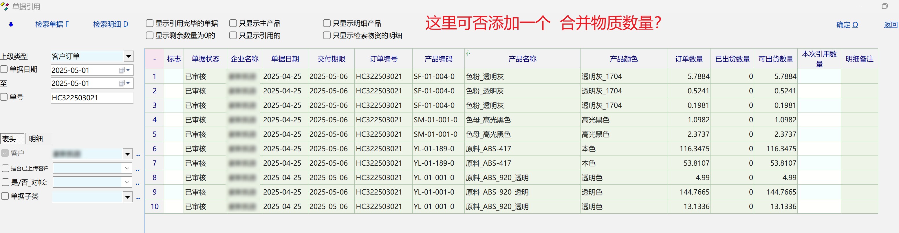 求助_单据在按F6引用界面时,可否添加一个 合并物质数量?_产供销