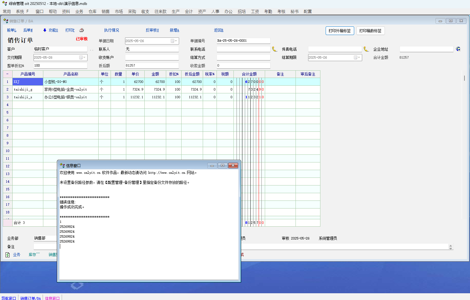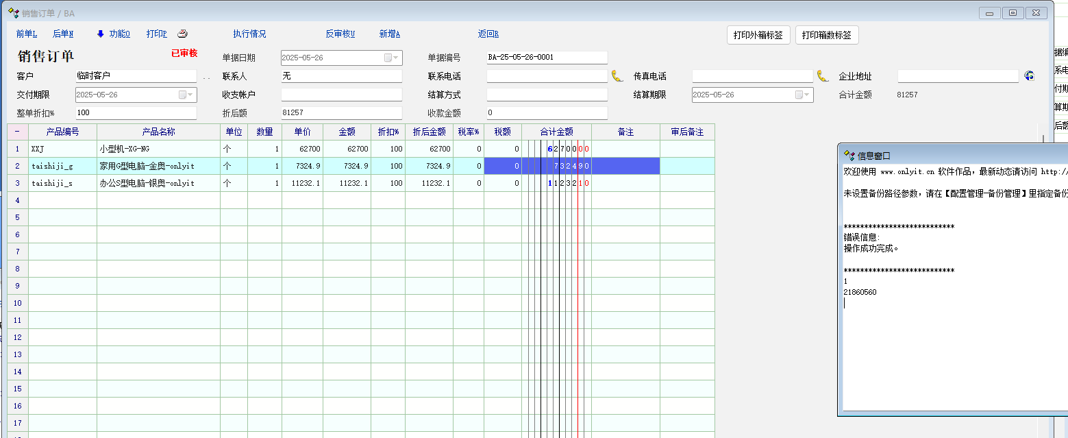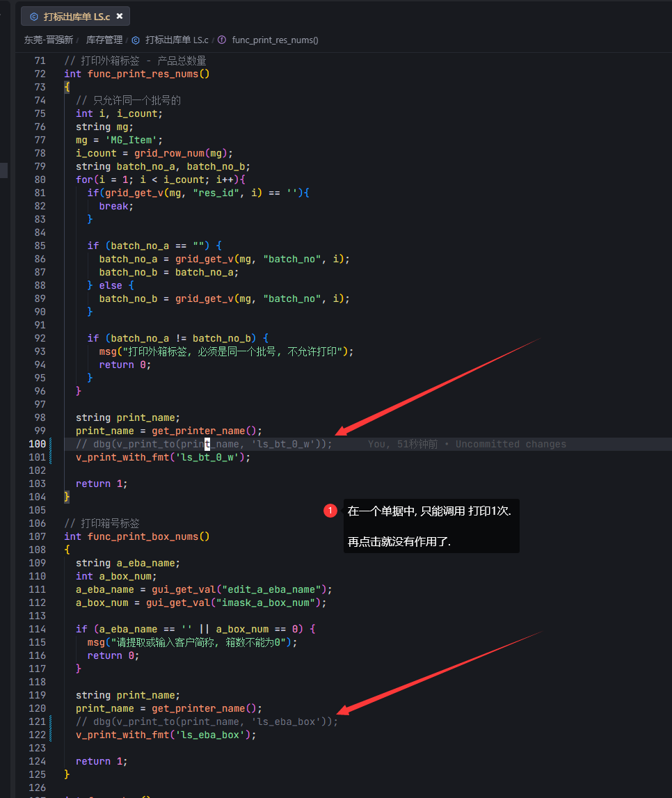 应用场景: 有些单据有多个打印模板, 有时候要静默打印, 添加了按钮在界面上, 点击之后,直接按模板打印. 突然发现只能点击1次. 打印成功之后, 再点击就不能打印. 必须重新切换单据, 才能正常打印. 脚本是在最新版本中, 使用销售订单, 生成默认的打印模板, 2个不同的模板. 图3是打印调试信息. // 打印外箱标签 - 产品总数量 int func_print_res_nums() { string print_name; print_name = get_printer_name(); dbg(v_print_to(print_name, 'v_ba')); return 1; } // 打印箱号标签 int func_print_box_nums() { string print_name; print_name = get_printer_name(); dbg(v_print_to(print_name, 'v_ba_1')); return 1; } int func_show() { gui_create_button("Panel_Func", 't5', 1050, 5, 95, 30, '打印外箱标签', 'call_csp.voucher.BA.func_print_res_nums'); gui_create_button("Panel_Func", 't6', 1150, 5, 95, 30, '打印箱数标签', 'call_csp.voucher.BA.func_print_box_nums'); return 1; }; |