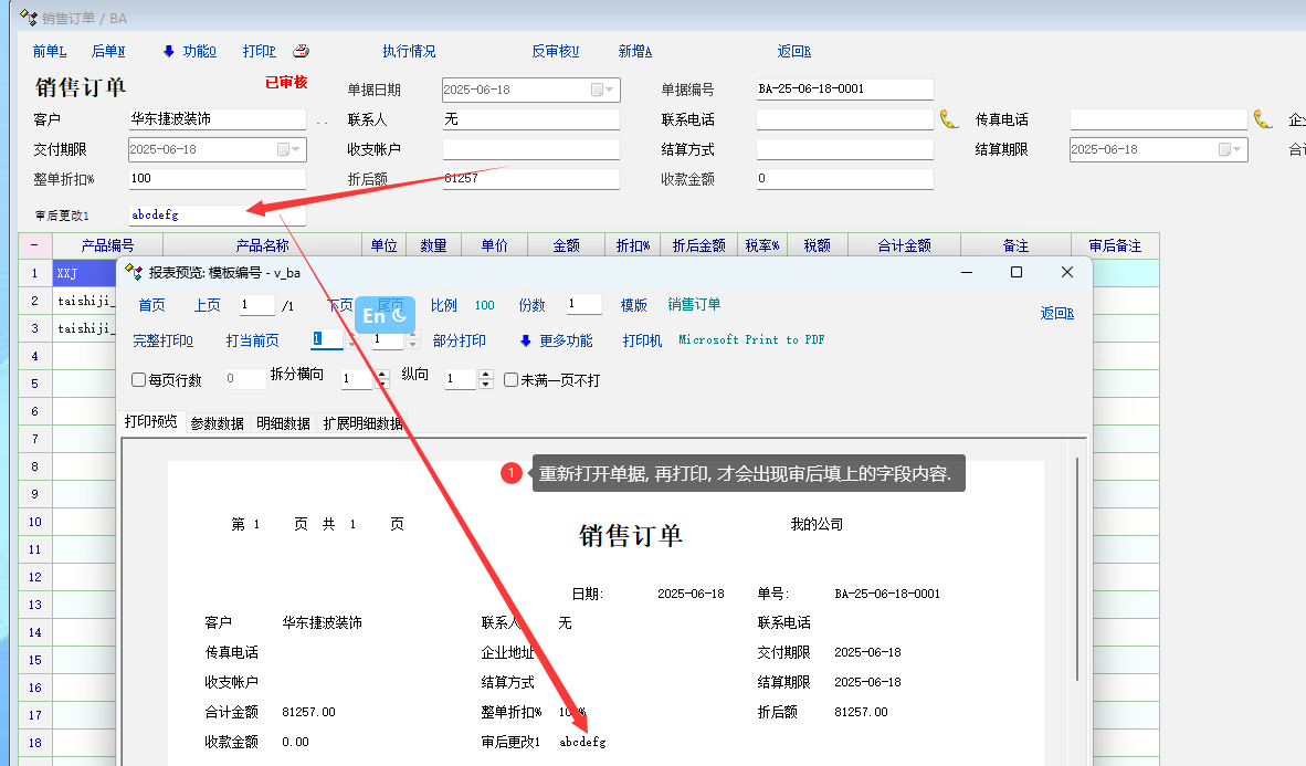 业务场景: 有时候单据审核后, 允许直接修改一些不重要的字段, 这时候打印, 内容不会带入打印模板中. 必须重新打开单据 操作步骤: 1. 打开已经审核的单据 2. 修改审后允许修改的表头属性 3. 点击打印(有问题, 刚修改的内容不会传入打印模板中) 4. 必须重新打印单据 , 再打印, 才会有步骤2中的内容. 详细看图 |