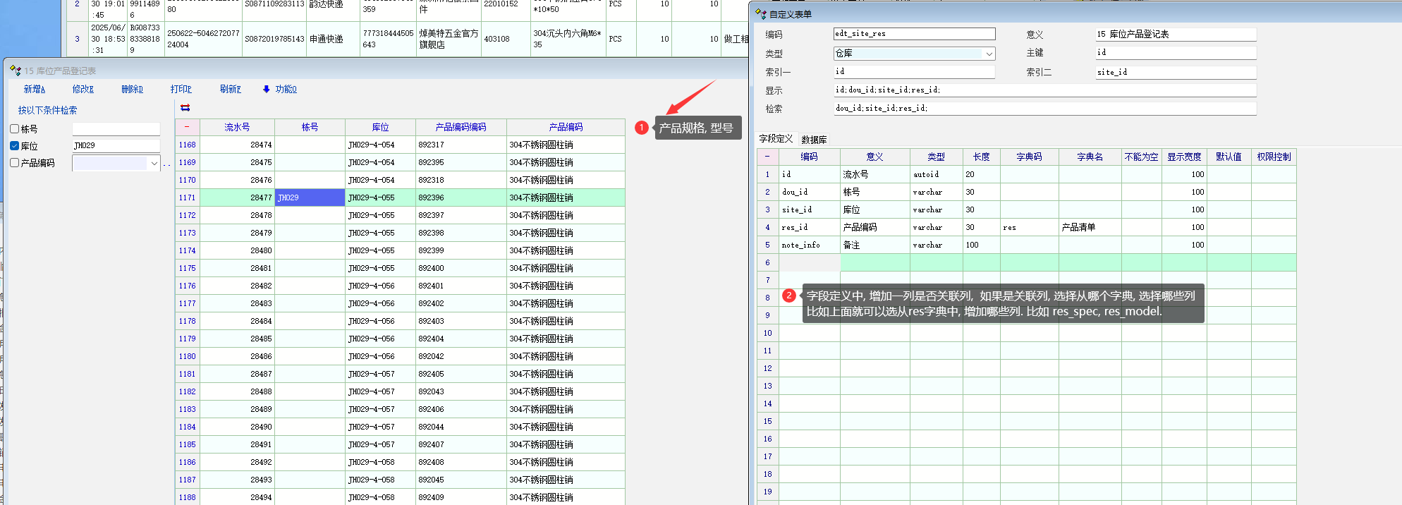 应用场景: 比如有个表单中查询了产品资料, 选择了产品字典. 想显示 规格, 型号... 建议定义中, 增加几列, 可以添加字典的相关列进入, 在创建数据表的时候, 就跳过这些相关查询列. 详细请看图: |