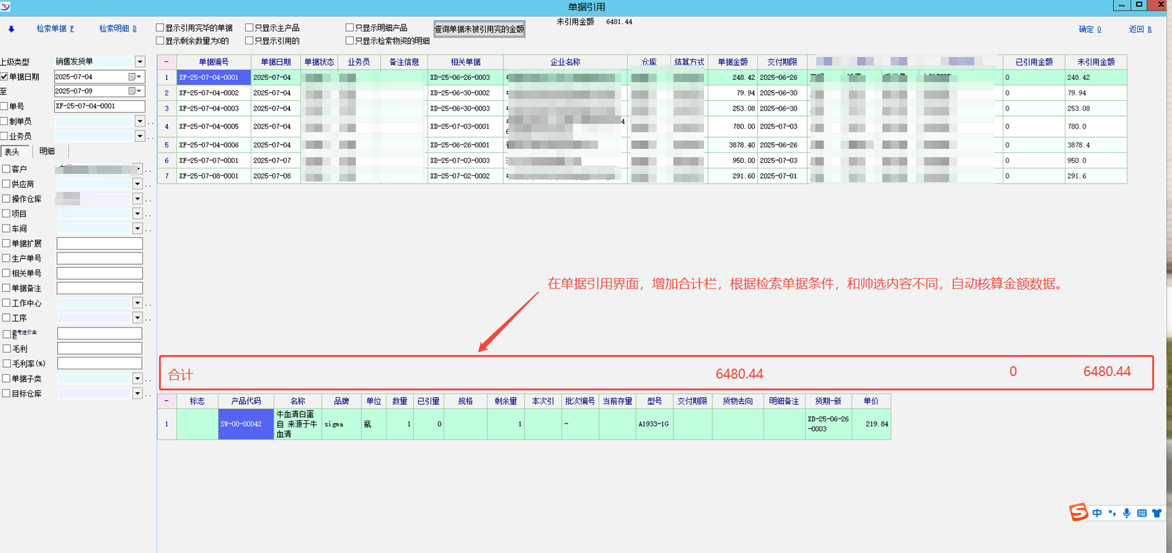 现状描述:在F6引用界面想根据不同的客户,或者所有客户,查询单据金额时,无法自动汇总该数据。