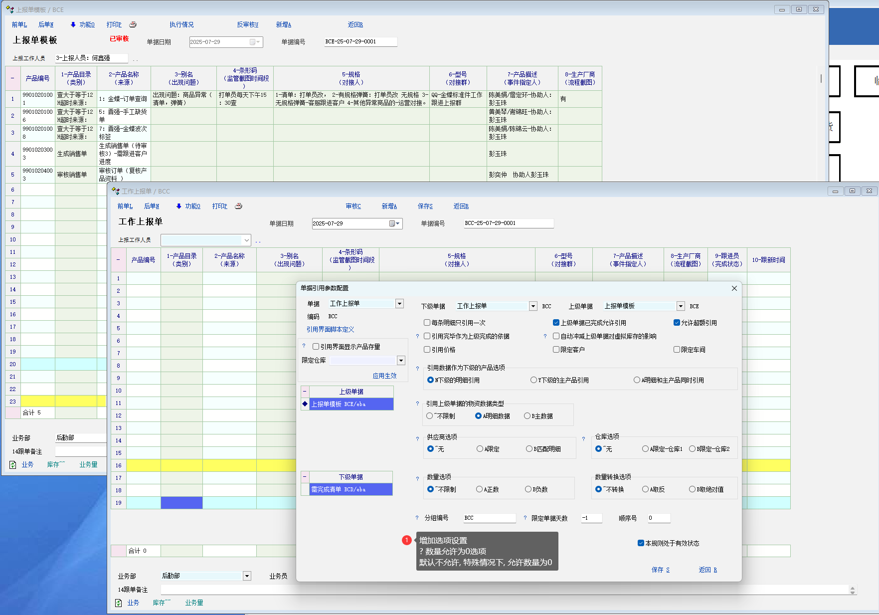 截图中的 ?数量允许为0选项.. 建议更改为: 数量为0时生成明细, 两个选项: 生成, 不生成. 默认不生成, 符合目前中系统的逻辑, 特殊情况就设置为生成. 这样数量是0的情况下, 也可以生成下级单据. |