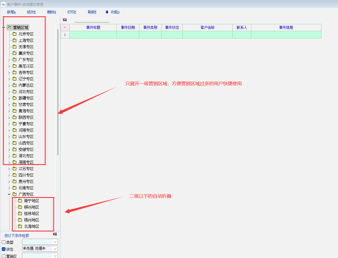 建议在客户联系人,客户联系,客户线索,商业机会,投诉建议中只展开1级营销区域,