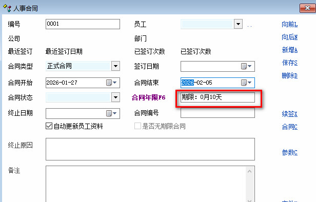 希望和人事劳动合同模块一栏,录入开始时间和结束时间后,能自动得出“用时”