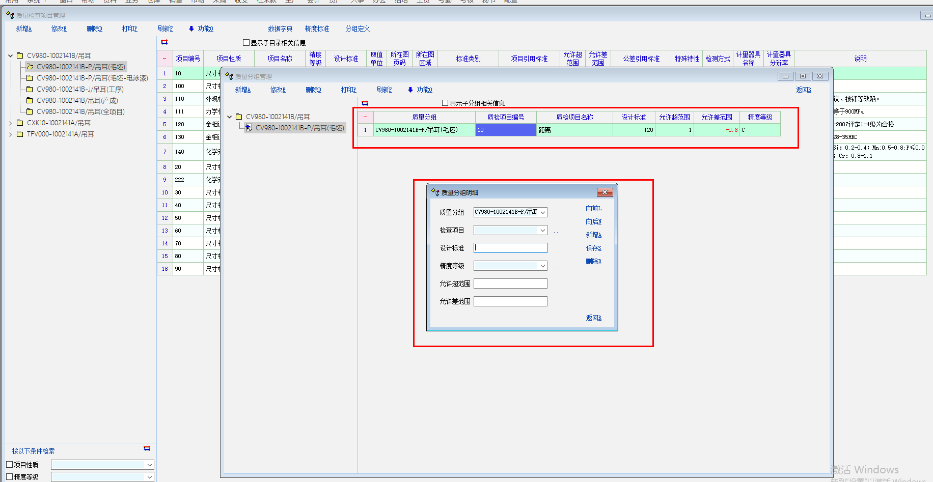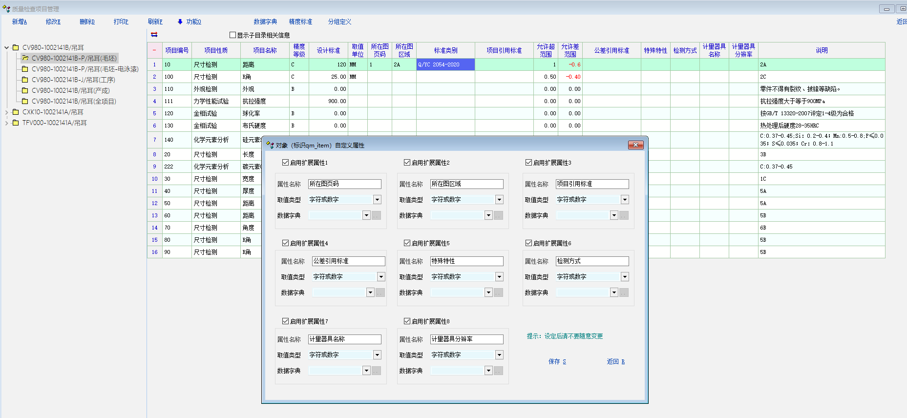 根据目前质量检查项目原有的项目栏不够,太单一了,不够详细,在使用扩展属性定义里增加八个属性栏,但这增加的属性栏有个问题,只能在检查项目管理里有效,分组定义这边不能把重要的扩展改属性栏带入过来,还有质量单据里,也没法显示出扩展后的属性明细栏,请考虑给增加项目管理里面编辑栏10个,目前的可编辑栏项目太少了,还有请把项目管理的编辑项也能带入到分组定义和质量单据里,目前这扩展属性定义扩展后的使用没什么效果了。请软件方老师给解决一下,谢谢