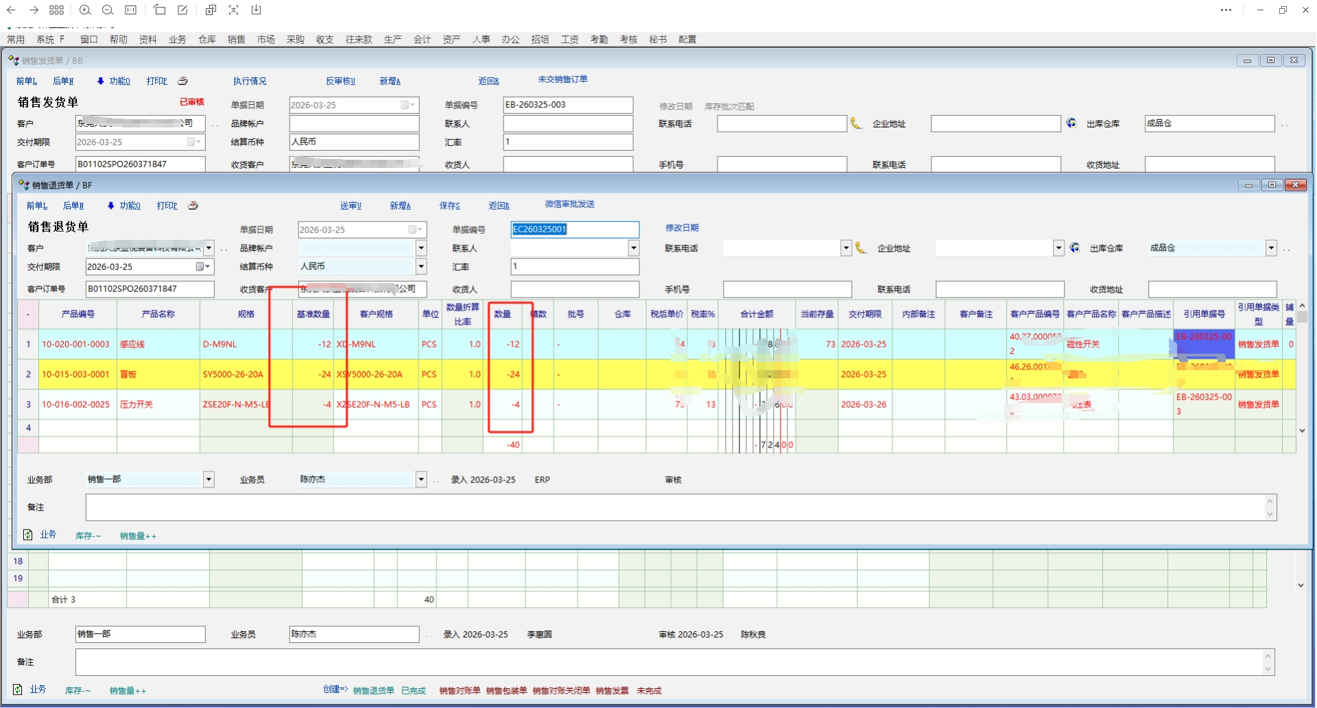 引用流程设置 取反值时,由销售发货单 直接创建退货单就会这样,单据如果影响库存就有问题。如果引用界面里F6 就是对的。