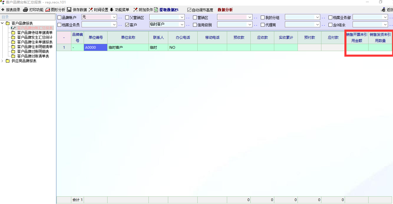 要写的脚本思路是:在【客户品牌台帐汇总报表】中显示一列为,该客户同一品牌帐户 且 已审核销售订单,的销售开票未引用合计金额。