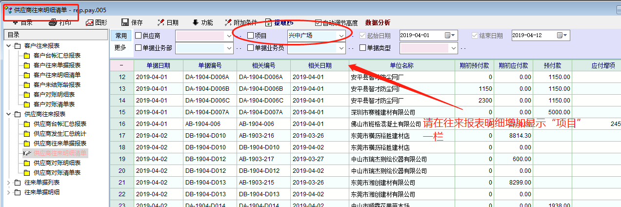 建议在往来报表中增加“项目”一栏,因为在按项目核算的单位,也经常查找、统计“项目”的往来数据,又因为在做物资单时,一般已经设置了“相关项目”,在此统计显示应不难。