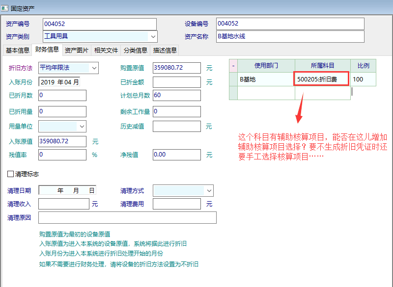 在资产卡片中可以指定资产的折旧会计科目,方便自动生成折旧凭证,但是在指定会计科目时没有相关的辅助核算选项,但是在实务中,为了区分成本项目,个别折旧科目使用了辅助核算,因此建议在资产卡片中增加折旧科目的辅助核算选项,以适应此需求,否则每次还要手工来选择,如果固定资产比较多的话就非常不便。