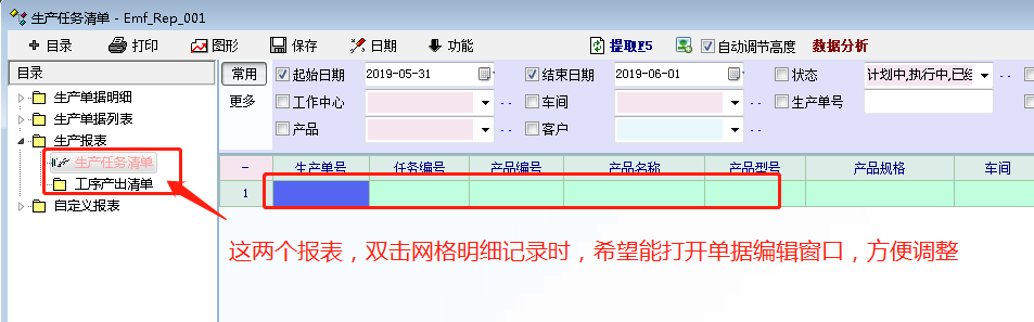求助_请帮忙调整“生产报表”中下图的两个子报表,双击明细能打开单据编辑窗口_产供销