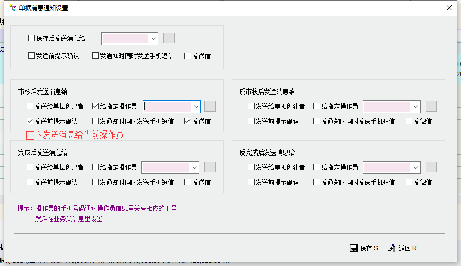 虽然系统中可以选择要接收消息的操作员,但每次都要作选择,还是觉得繁琐。或者老师可以在消息通知设置中添加一个是否发送消息给当前操作员的选项。
