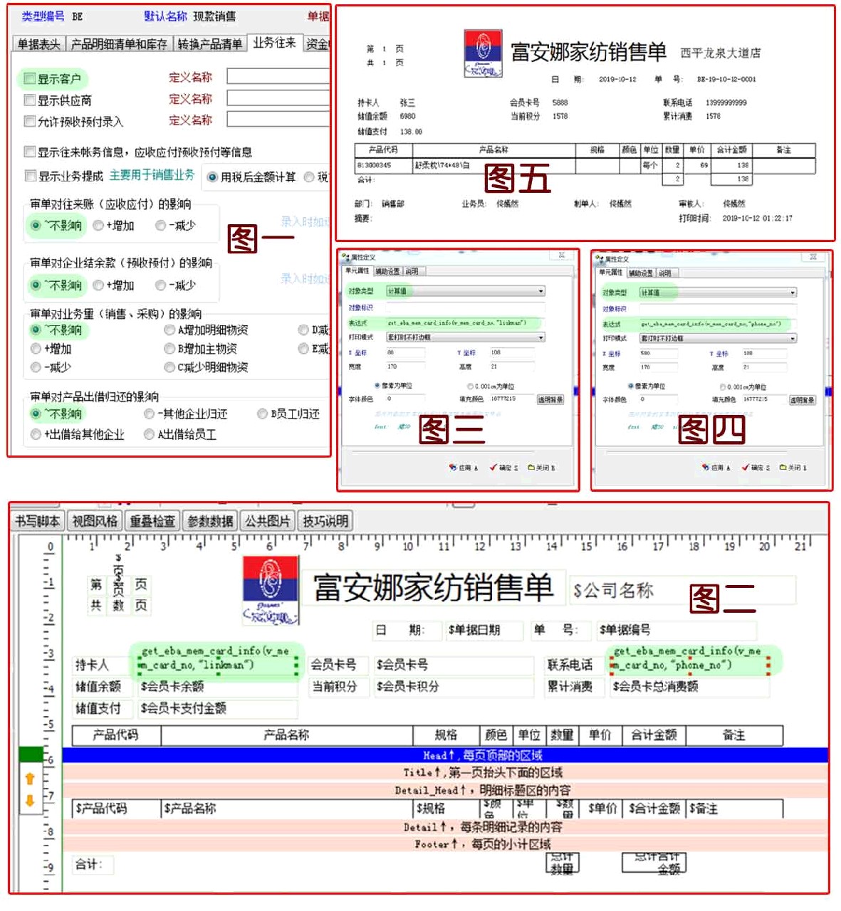 非常感谢二楼037大神!我上面的问题完美解决! 为方便与我有同需求的朋友,我把037大神给的解决方案公布如下: 小微型进销存用户,为简化操作流程,想要摒弃“客户管理”而直接使用会员卡的的朋友,请参照本人一楼和三楼的问题,看以下解决方案。 1.首先,设计销售单时,表头上不能勾选“客户”,并且审单时不能影响客户相关数据,否则审核时报错。 依次点开:资料→业务环境→现款销售→业务属性→业务往来 去掉勾选的“显示客户”,然后把“审单对往来账......”,“审单对企业结余款......”,“审单对业务量......”,“审单对产品出借......”四项全部选“不影响”。如图一。 2.进入销售单据打印“模板设计“界面,如图二 其它项目均可使用系统给出的“对象标识“,只有联系人和联系电话,不能使用系统提供的“对象标识”。 037大神给出了使用脚本函数提取相关资料的建议 持卡人使用 get_eba_mem_card_info(v_mem_card_no,"linkman") 联系电话使用 get_eba_mem_card_info(v_mem_card_no,"phone_no") 具体使用方法如下: 持卡人和联系电话的单元属性里,对象类型选择“计算值”,对象标识不填,把上面两个脚本分别填入“表达式”栏。如图三、图四。确认后注意保存,或另存一个单据模板。 至此,打印出来的单据,完美呈现出持卡人和联系电话,如图五。 |