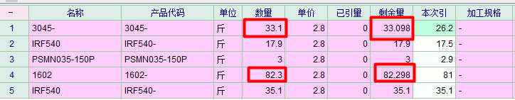 如图,未引用任何数量,但第一项3045的数量33.1显示的剩余量是33.098,第4项1602的数量83显示的剩余量是82.298。两个都是相差0.002,其它几项就正常。请问是什么原因,如何处理。