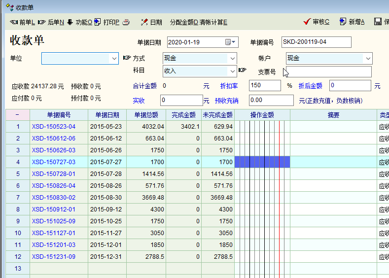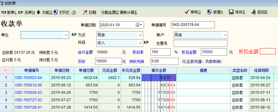貌似系统收款单中的通过折扣率、折后金额可以完成此操作。但当输入折后金额和实收金额时,系统并不会自动计算折扣率,所以要在这收款单中完成抹零,如下图中,实际收款14000元,但要抹掉14137.28的账,就必须先算出折扣率,输入正确的折扣率后才能把尾数137.28摸掉。实际操作中还发现系统中的折扣率没法输入小数点。所以是没法完成具体操作的。