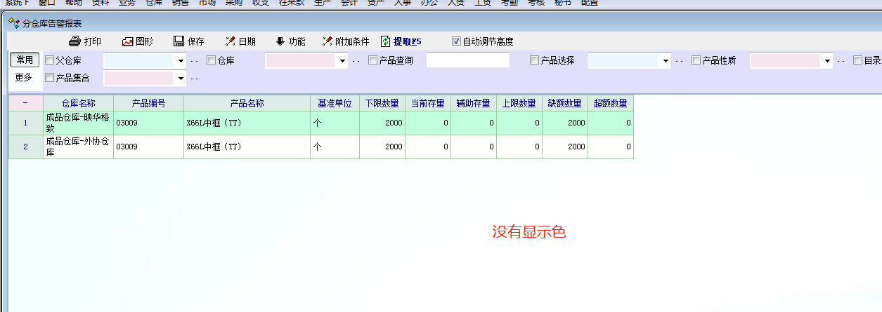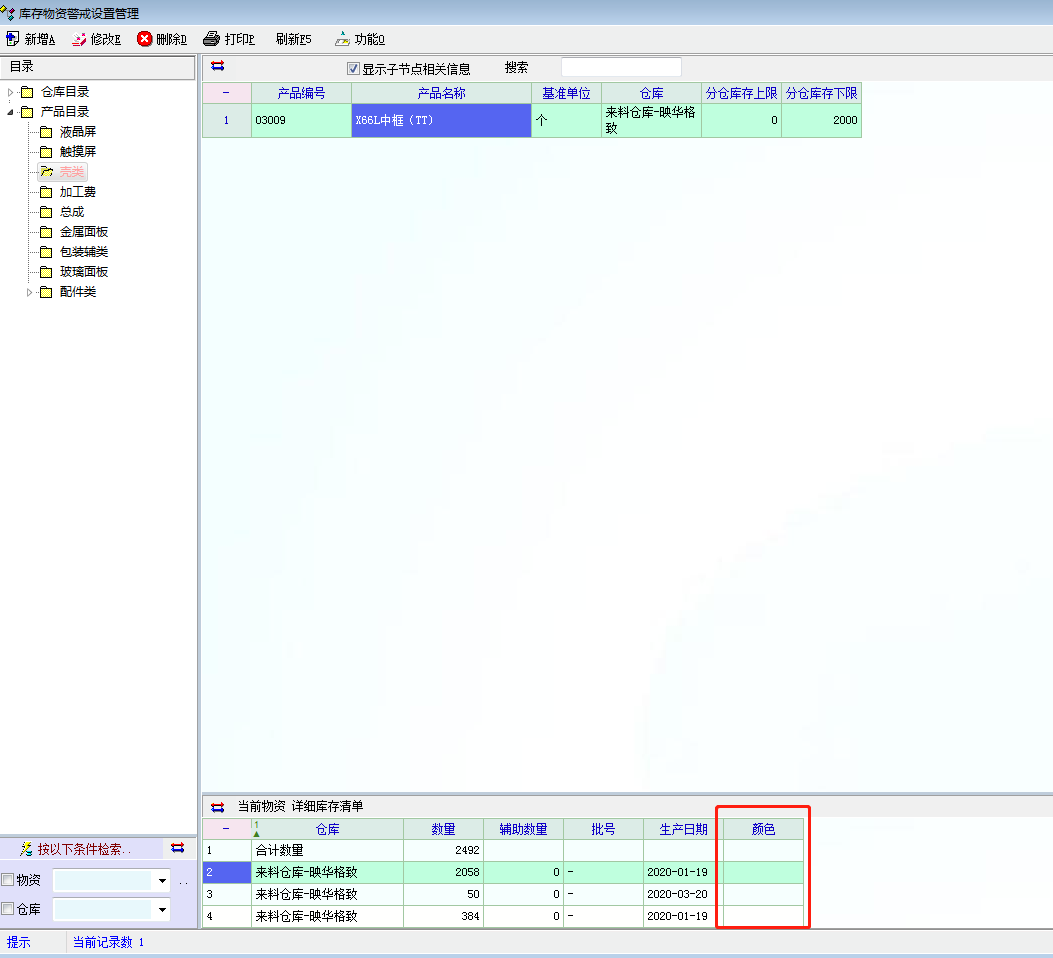 公司一个产品,按色进行区分库存,在库存清单中能正常显示各种色的库存信息,但是在库存物资警戒设置管理中却看不到色,进入软件弹出的分仓库告警报表中也看不到相应的色的预警,请老师帮忙看看。