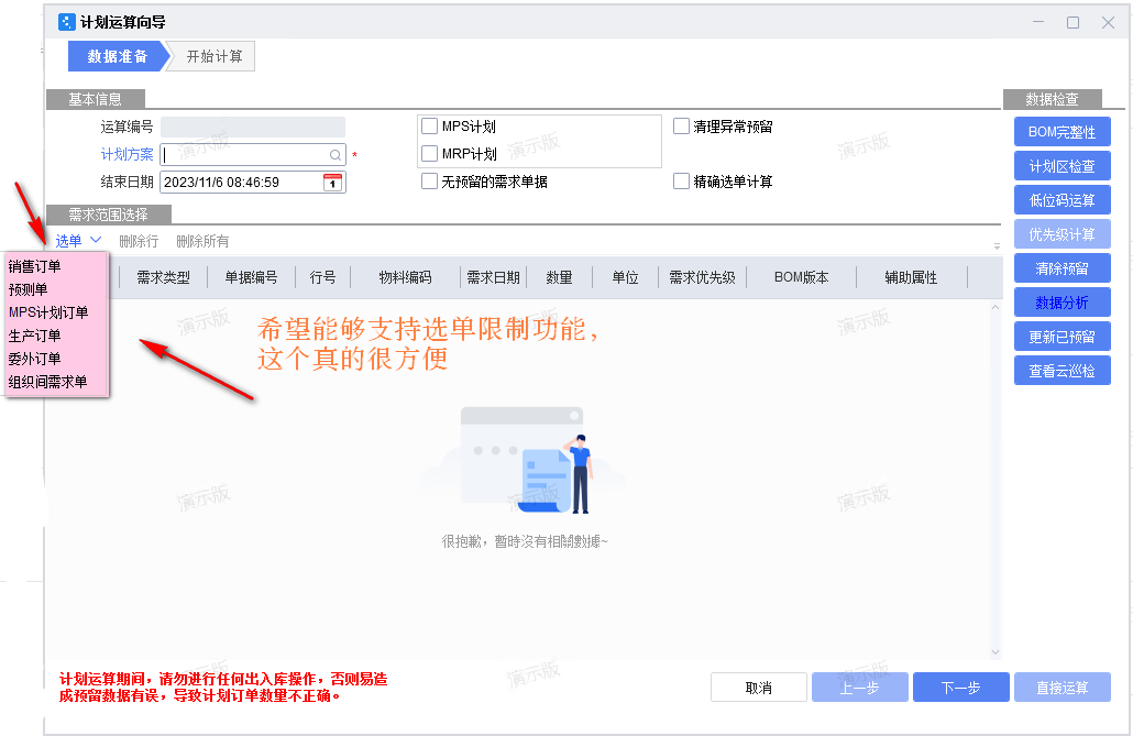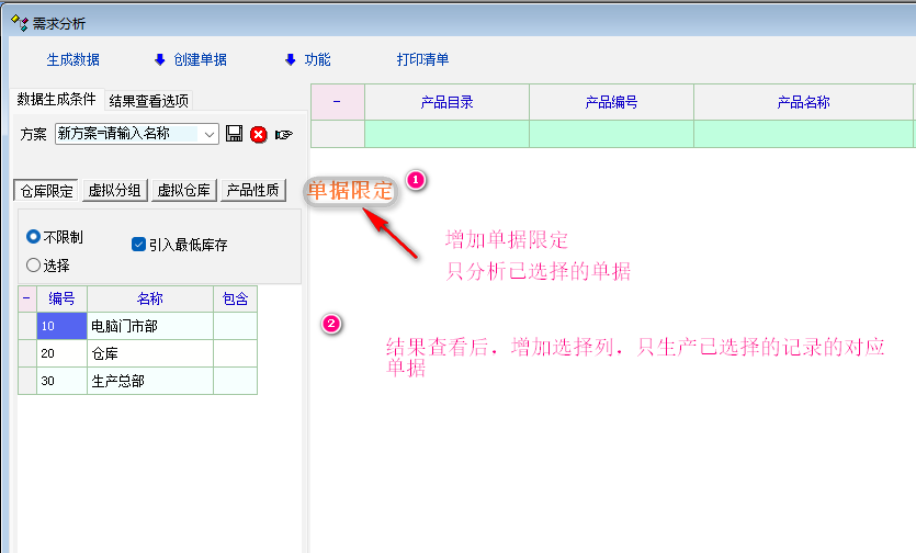 以方便针对特定的单据或指定的产品进行需求分析